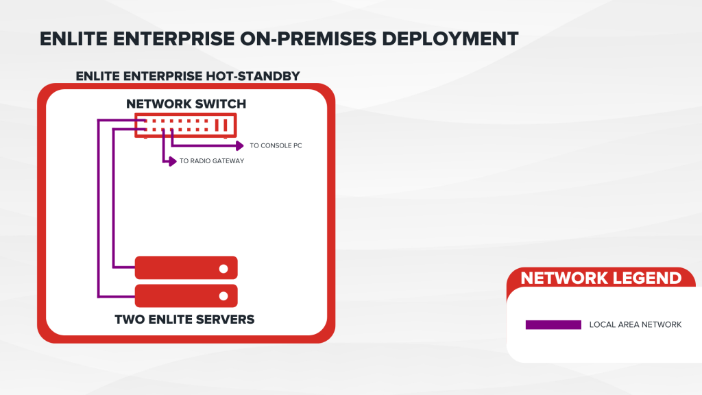 The diagram below showcases an on-premises deployment of Enlite utilizing a traditional redundant hot standby server architecture. In case of a server failure, the previously active server switches to the other to ensure efficient failover. When this takes place, there is minimal disruption to the dispatcher as the next server becomes active.